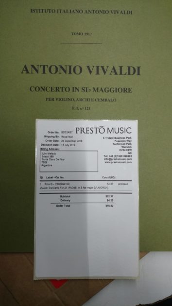 Tenía un pedido hecho a la gente de Presto Music desde hacía varios meses. Por alguna razón, Correo Argentino no entregó el pedido. Haciendo el reclamo, Presto Music respondió que enviarían nuevamente el libro con la partitura edición Ricordi, de Antonio Vivaldi. Y cumplieron. Me llegó hace instantes.